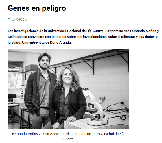 Doctores en Ciencias Biológicas, docentes de la Universidad Nacional de Río Cuarto y, tercera coincidencia, ambos tienen perfil muy bajo. Tanto, que a lo largo de la charla señalan reiteradas veces que es la primera entrevista que otorgan grabador de por medio. Fernando Mañas y Delia Aiassa forman parte de un grupo de 23 personas que investigan desde hace ocho años los efectos de los agroquímicos en las personas. Han publicado quince artículos en revistas científicas, un libro, y llegaron a una conclusión tan alarmante como invisibilizada por funcionarios, empresas y medios de comunicación: las personas expuestas a contacto con agroquímicos padecen daño genético. Lo que implica tener mayores posibilidades de contraer cáncer, sufrir abortos espontáneos y nacimientos con malformaciones. Son las pruebas científicas de aquello que denuncian las familias fumigadas con agroquímicos.